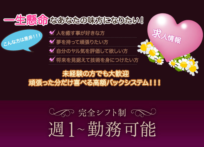 当店はセラピストデビューを応援しております! 未経験の方も安心して働いていただけるように、女性講師による無料研修制度を完備しております。 実際にセラピストデビューした後も、わからないことや気になること、不安なことなど何でもご相談してください。 スタッフ一同、セラピストとして頑張るあなたを全力でサポートいたします!